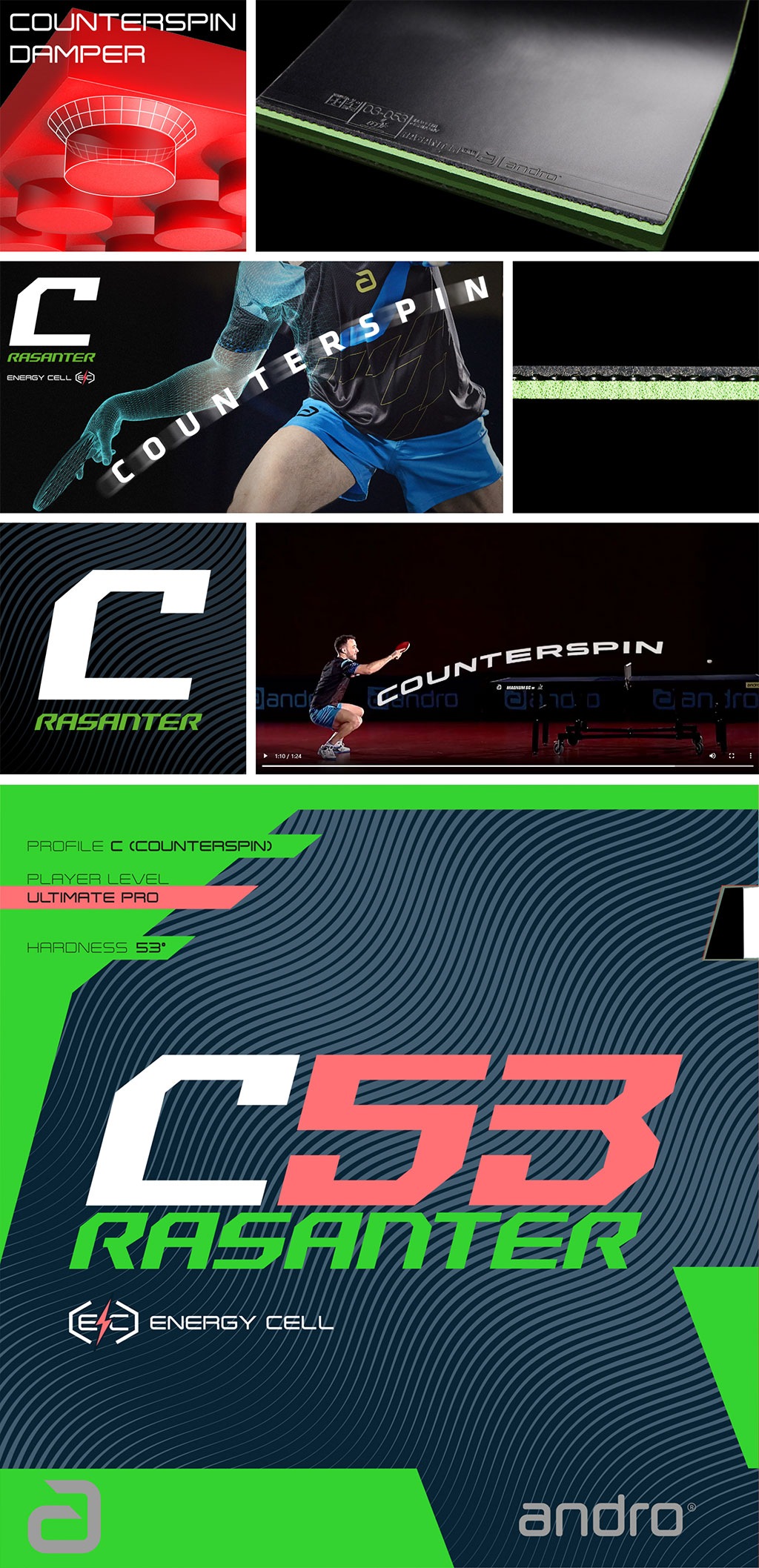 탄성이 높은 셀 구조의 <Andro Energy CELL 스펀지>는 특히 빠르고 강한 탑 스핀에 매우 역동적인 에너지를 전달합니다.