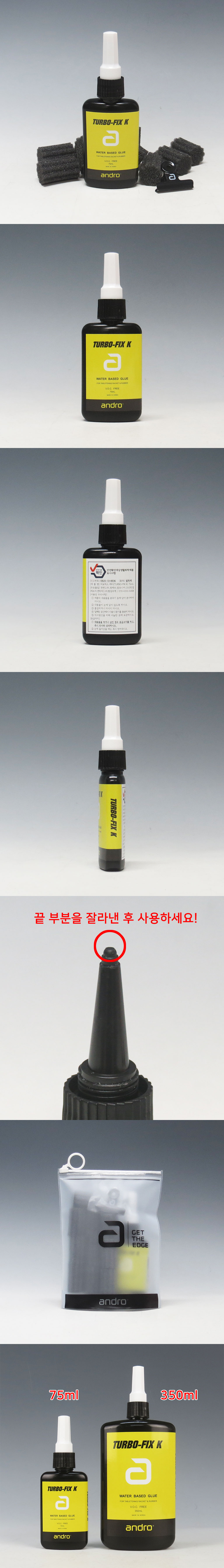 Turbo-Fix K(터보-픽스 K) 글루는 국제 탁구 연맹(ITTF)의 규정을 준수하는 워터베이스 글루입니다. VOC 를 포함하지 않아 안전하며 제거 역시 손쉽게 할 수 있습니다. 크리미한 발림성으로 기공이 큰 스펀지에도 잘 대응하도록 고안되어 있습니다. 세트에는 스펀지 10개와 클립 1개의 편리한 도구가 제공되어 쉽고 고르게 글루를 바를 수 있습니다. 75ml 와 350ml 의 용량으로 판매되어 필요에 따라 선택할 수 있습니다.