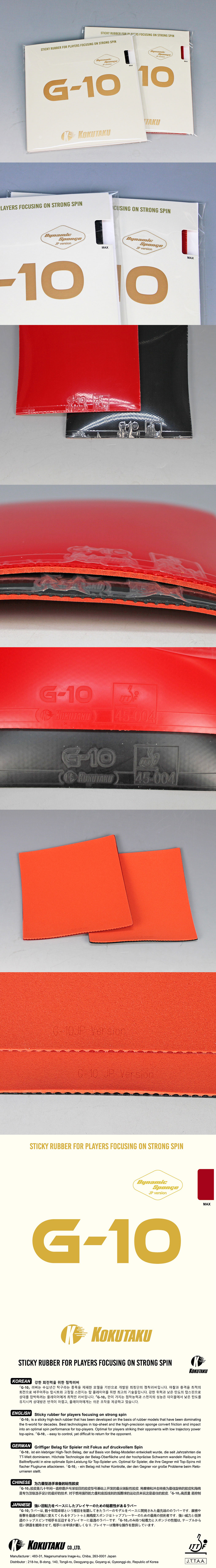 「G-10」 러버는 수십년간 탁구라는 종목을 제패한 모델을 기반으로 개발된 최첨단의 점착러버입니다. 마찰과 충격을 최적의 회전으로 바꾸어주는 탑시트와 고정밀 스펀지는 탑 플레이어를 위한 최고의 기술들입니다. 강한 위력과 낮은 탄도의 탑스핀으로 상대를 압박하려는 플레이어에게 최적인 러버입니다. 「G-10」 만이 가지는 점착능력과 스펀지의 성능은 테이블에서 낮은 탄도를 유지시켜 상대방은 반격이 어렵고, 플레이어에게는 쉬운 조작을 제공하고 있습니다.